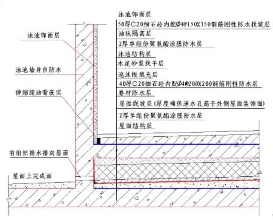 (2)、水景中的結構均采用混凝土澆筑,結構面外設計加做防水層。